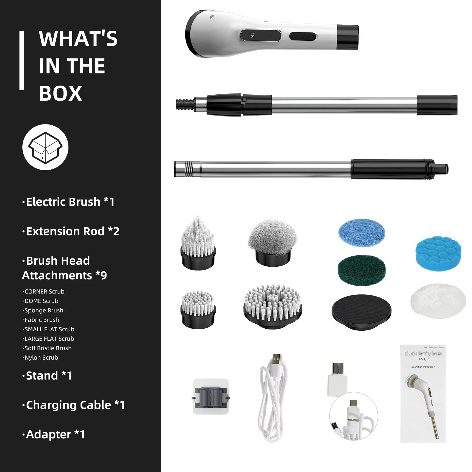 9-in-1 Multifunctional Cleaner: Includes 9 replaceable brush heads to meet various cleaning needs in kitchen, bathroom, and home.