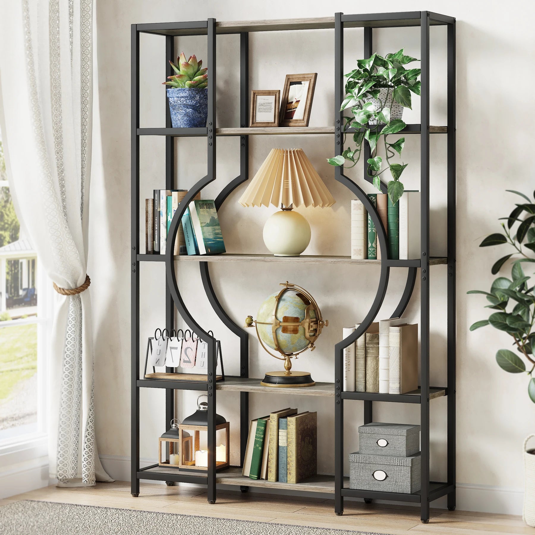 【Elegant Geometric Design】: Crafted with a black metal frame and rustic brown board, this bookcase with its curved silhouette design brings sophisticated flair to your favorite aesthetic. Fill the bookshelf with books, photos, plants, and decorations to make it an eye-catching of your home