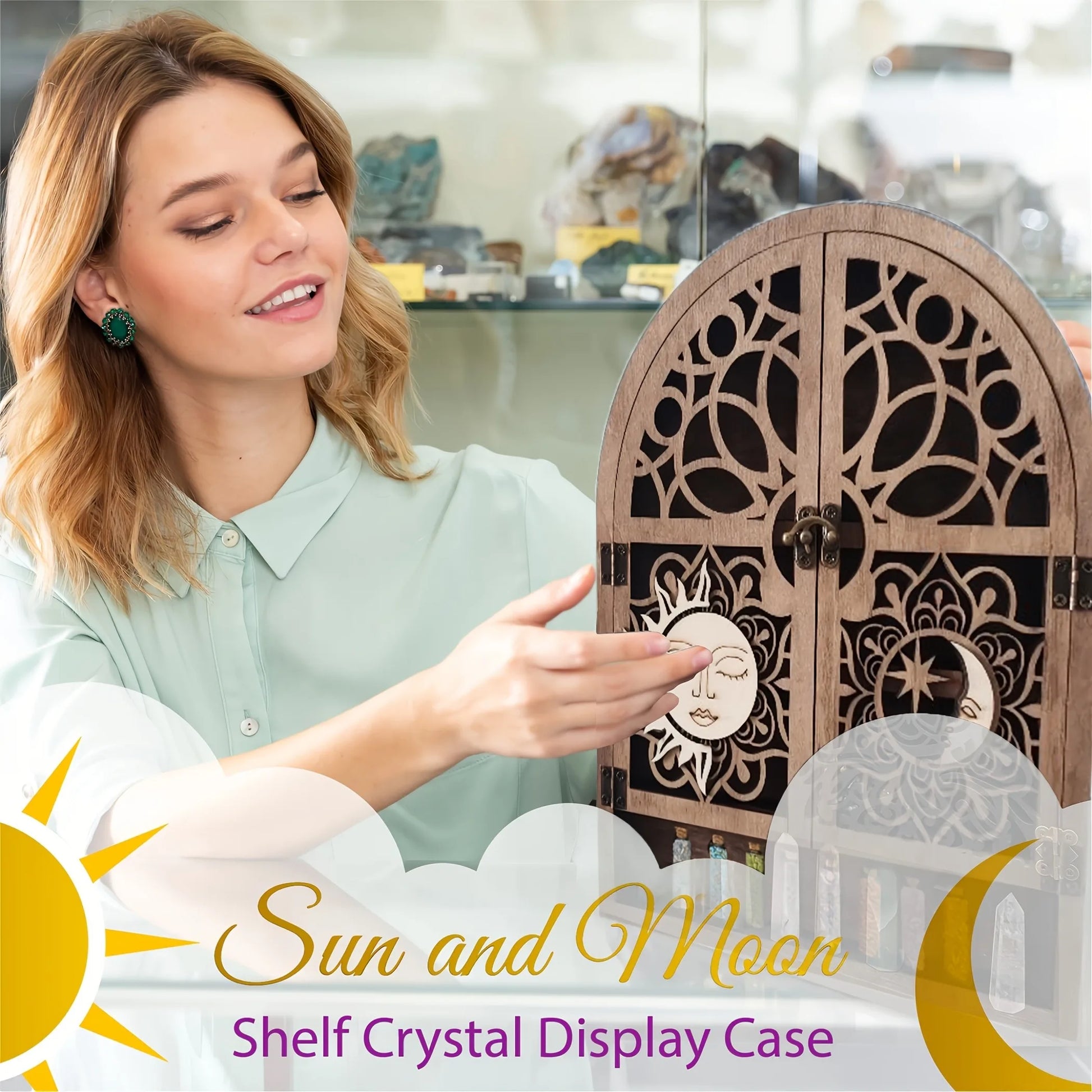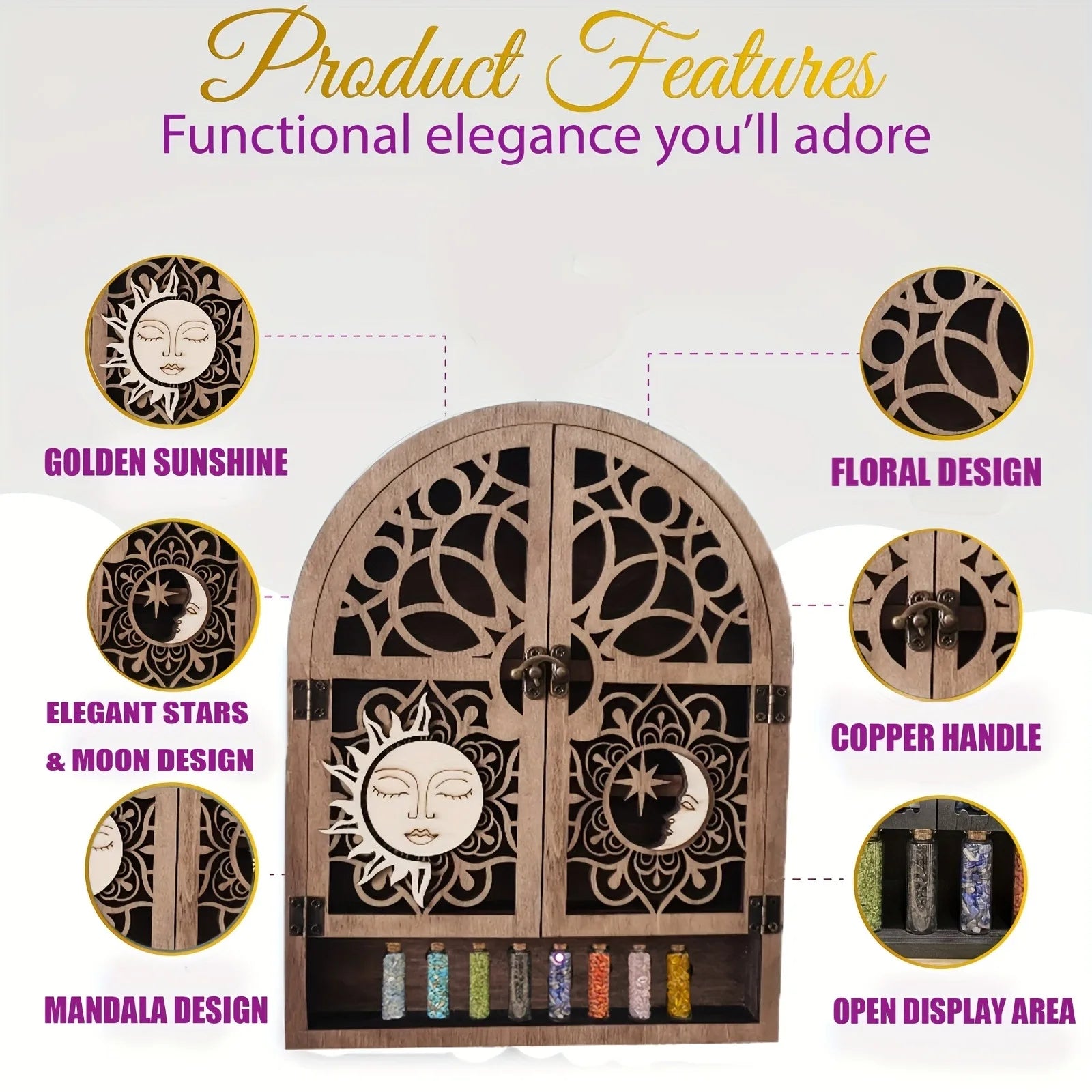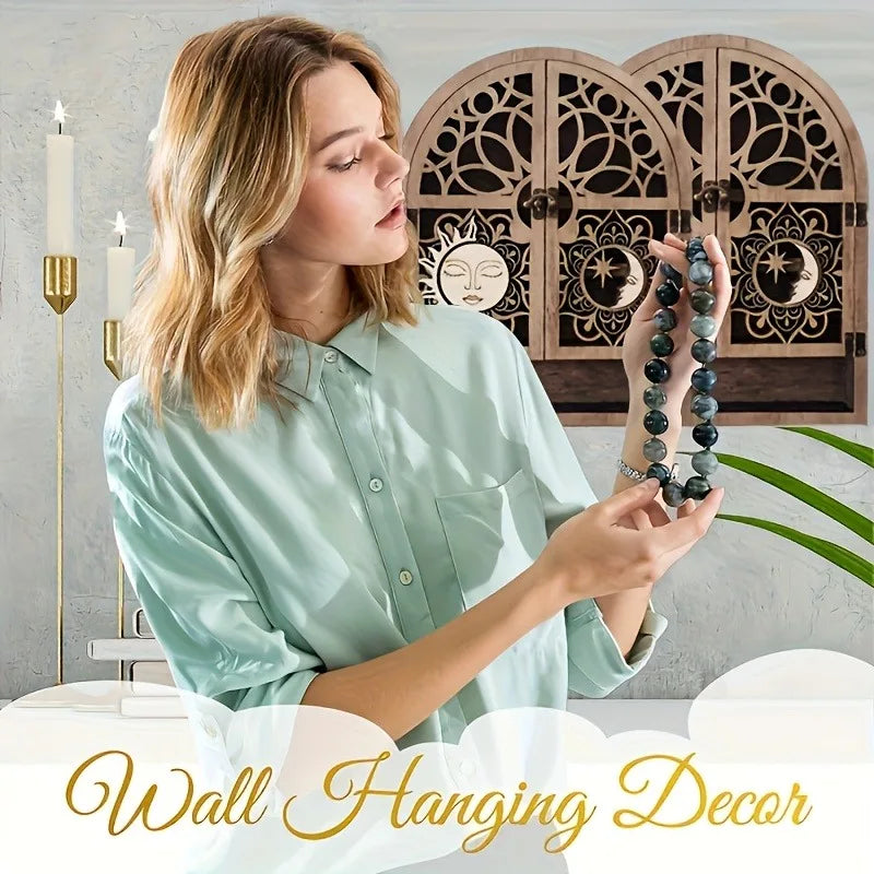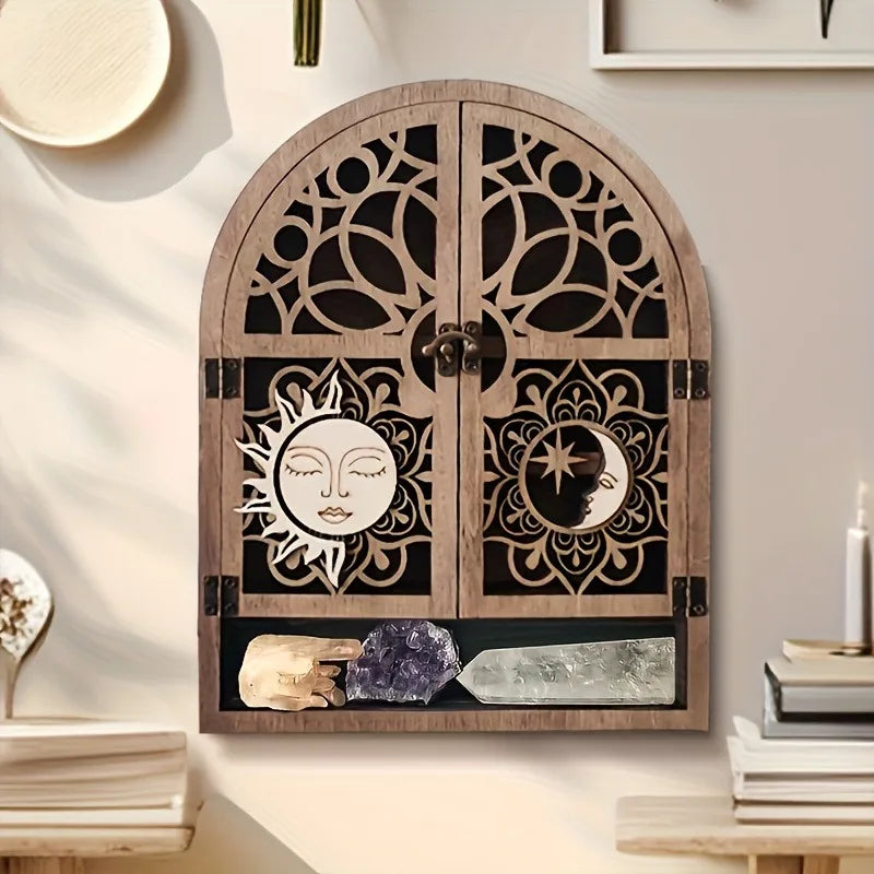 Vintage Wooden Floating Shelves With Sun And Moon Design. Wall Hanging Storage For Crystals, Nail Polish, Stones, Essential Oils. For Various Room Types.